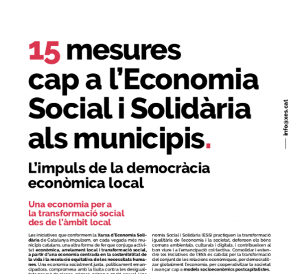 Amb 15 mesures cap a l’Economia Social i Solidàriala XES proposa consolidar i estendre les iniciatives ESS per tal de transformar el conjunt de les relacions econòmiques. Ho fan “tot abordant temes com la democràcia econòmica, les eines i espais de transformacióeconòmica, la gestió del patrimoni col·lectiu, el canvi cultural i col·lectiuo l’acompanyament de les noves iniciatives socioeconòmiques”. Per altra banda, també es proposen mesures sobre temàtiques com les finances, la intercooperació, el Mercat SocialLocali el consum responsable; la compra ila contractació pública, la recuperació d’empreses i el relleu empresarial.