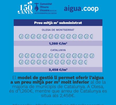 Aigua.Coop va afegir-se un any més a la commemoració d’aquest Dia Internacional amb la posada en marxa d’una campanya conjunta amb la Comunitat Minera Olesana que va servir per difondre els beneficis d’apostar per l’economia social. Concretament, la campanya, distribuïda a través de Facebook, Twitter i Instagram, es va centrar en tres conceptes fonamentals per a la CMO, a qui va agafar d’exemple. Els conceptes van ser sostenibilitat, eficiència i estalvi. Així, l’acció va posar l’accent en el fet que la CMO ha reduït el consum energètic per punt de servei del 89% al 76% des del 2012; que ha abaixat la petjada mediambiental fins a 1,900Tm CO2 cada any, o que el seu model de gestió li permet oferir l’aigua a un preu mitjà per m3 molt inferior al de la majoria de municipis de Catalunya. A Olesa, és d’1,260€, mentre que arreu de Catalunya es situa als 2,458€.