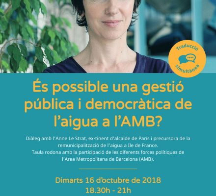 La responsable de la municipalització de l’aigua a París i impulsora de l’empresa pública que la gestiona, Anne Le Strat, ha parlat sobre la “possible gestió pública i democràtica de l’aigua a l’Àrea Metropolitana de Barcelona (AMB)?“, en una xerrada organitzada pel Moviment per l’Aigua Pública i Democràtica.