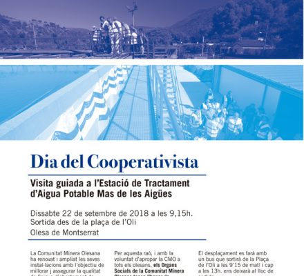 El proper 22 de setembre la Comunitat Minera Olesana celebrarà el Dia del Cooperativista amb una trobada amb els socis a l’Estació de Tractament d’Aigua Potable Mas de les Aigües. La jornada donarà inici als actes commemoratius del 150è aniversari de la cooperativa, que s’estendran fins al proper any.